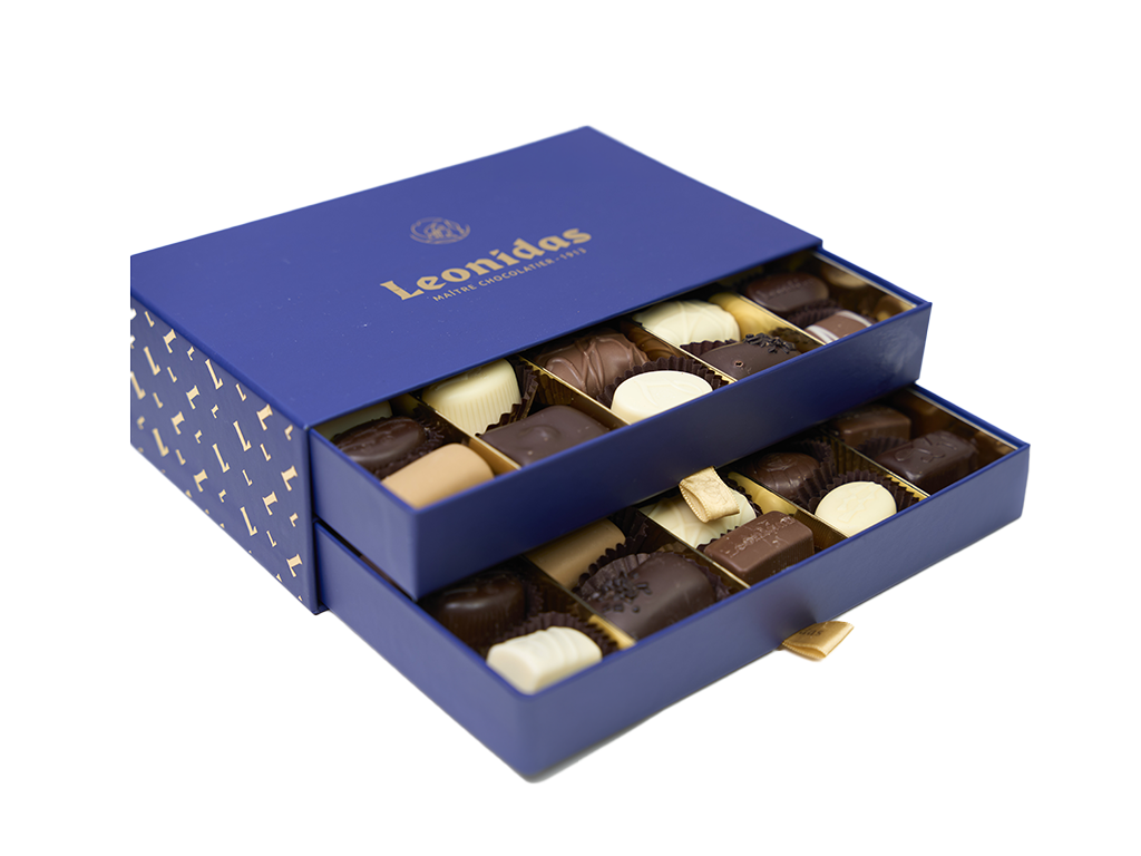 Coffret boîte tiroir composé d’un Assortiment de Chocolats : noir, lait et blanc, crème, ganache et praliné, le tout sans alcool.