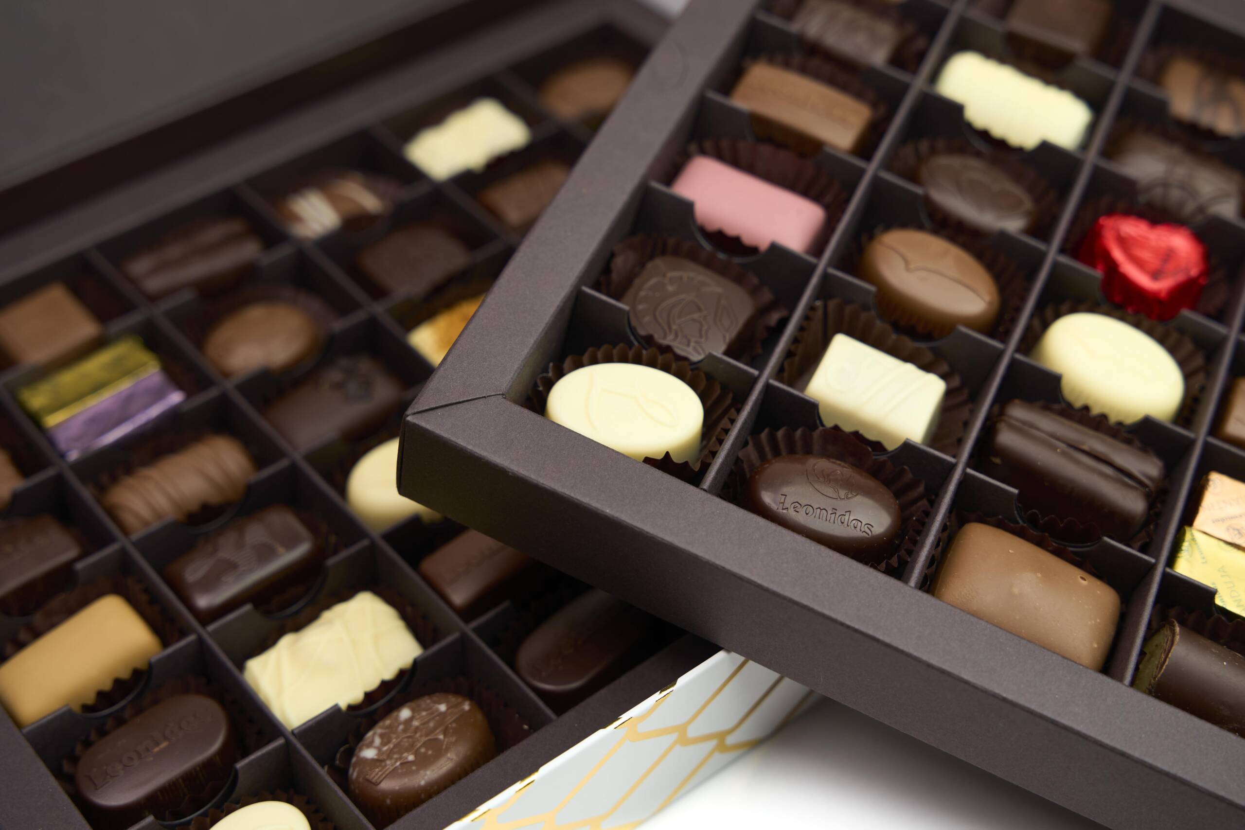 Coffret de Chocolats sur 2 étages composé d’un Assortiment de Chocolats : noir, lait et blanc, crème, ganache et praliné, le tout sans alcool.