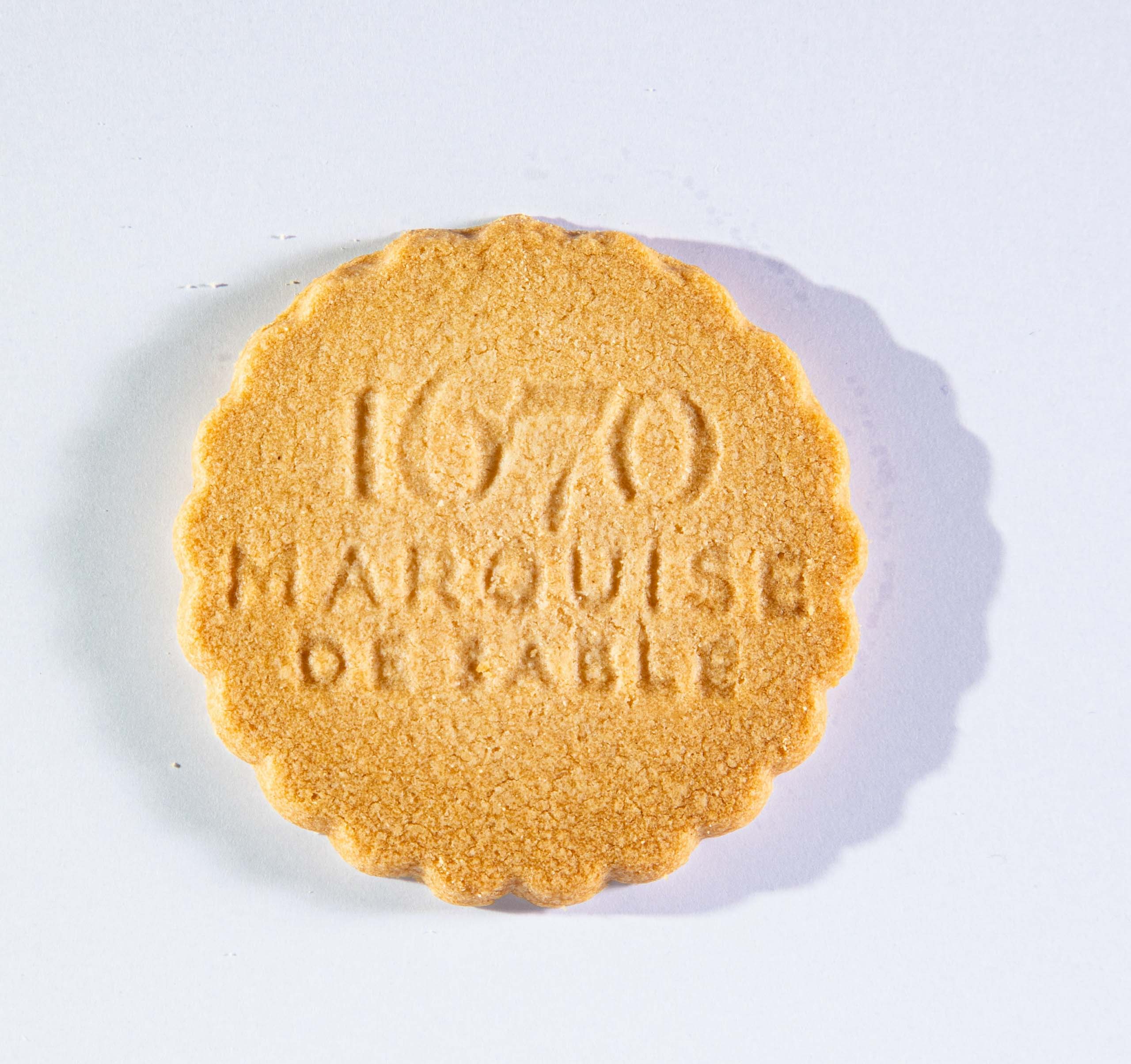 Biscuits sablés pur beurre, délicatement dentelés. Quatre sachets fraîcheur, chacun contenant 4 biscuits, présentés dans un étui carton raffiné « Les Petits Sablés » Marquise de Sablé
