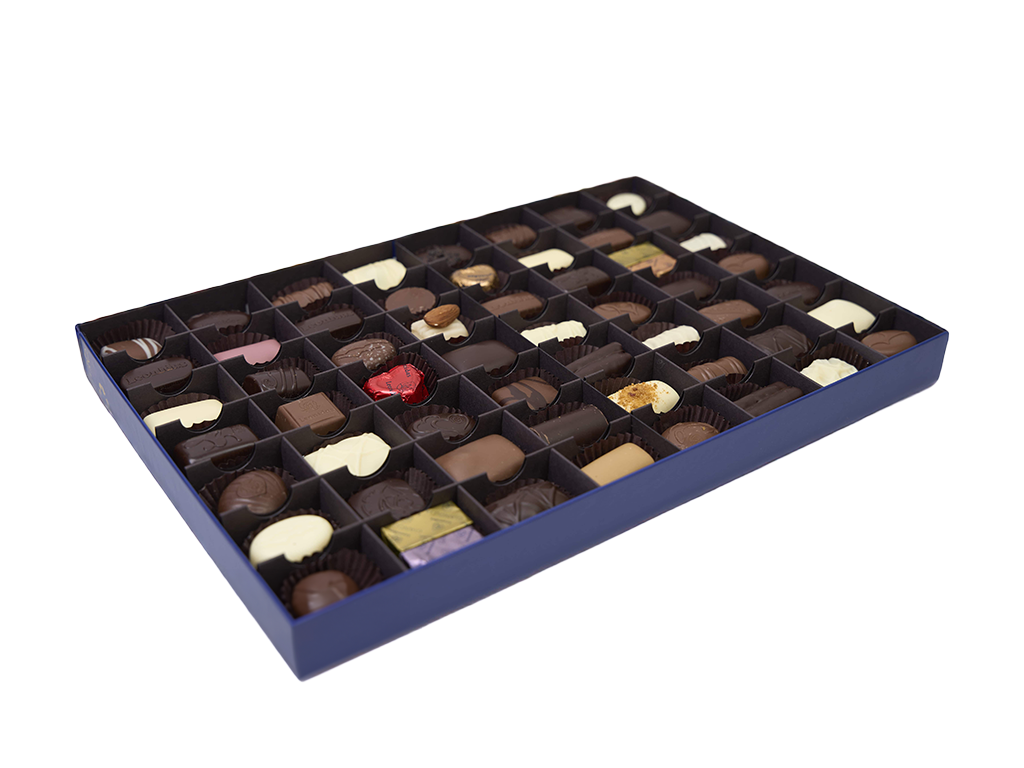 Coffret héritage Bleu XL composé d’un Assortiment de Chocolats : noir, lait et blanc, crème, ganache et praliné, le tout sans alcool.