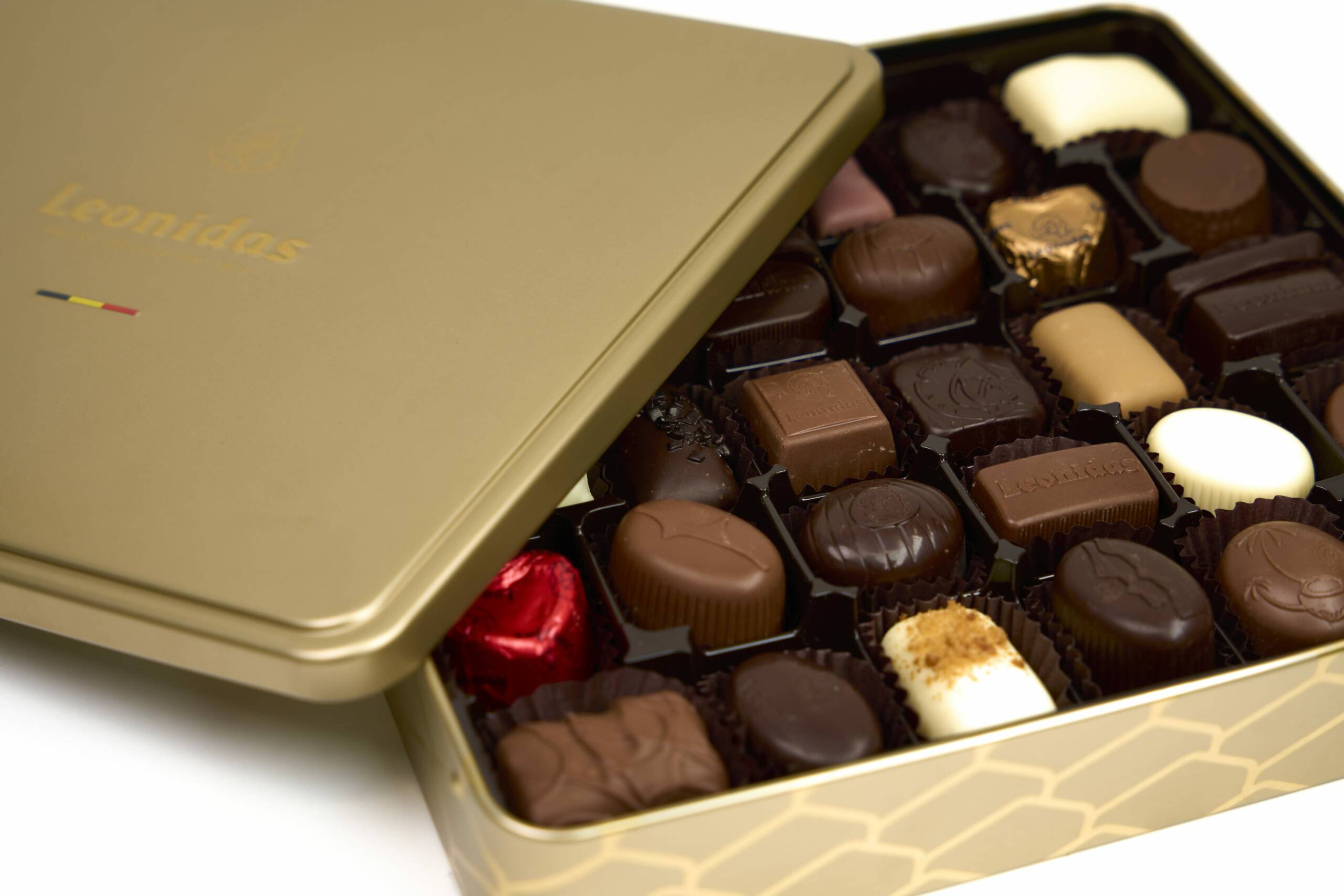 Boîte métal Doré composée d’un Assortiment d’une trentaine de Chocolats : noir, lait et blanc, crème, ganache et praliné, le tout sans alcool.