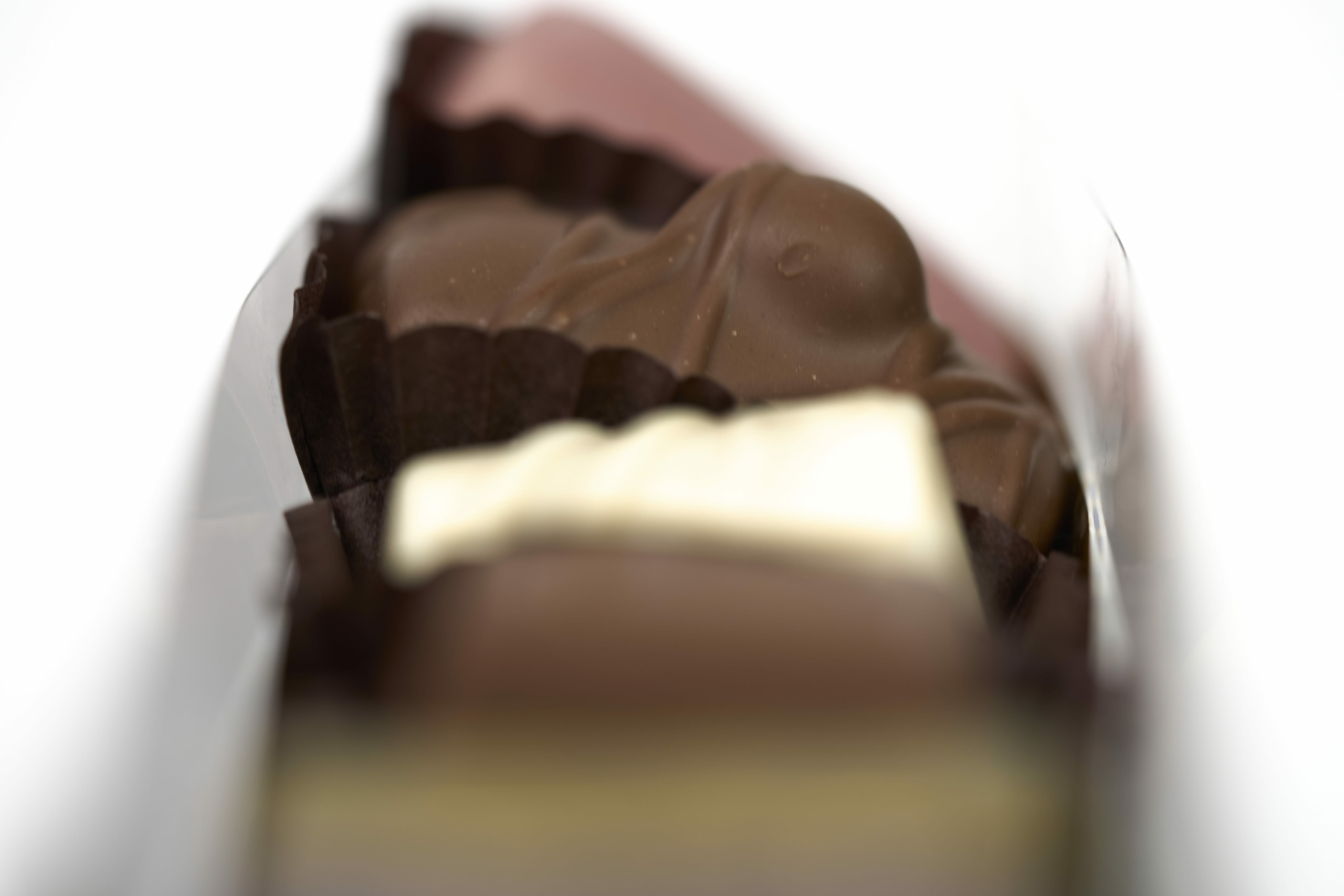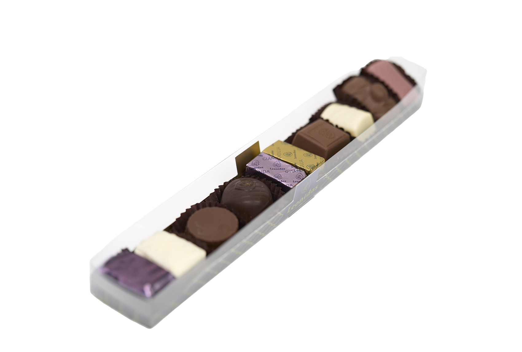 Réglette en plexi composée d’un Assortiment de Chocolats : noir, lait et blanc, crème, ganache et praliné, le tout sans alcool.
