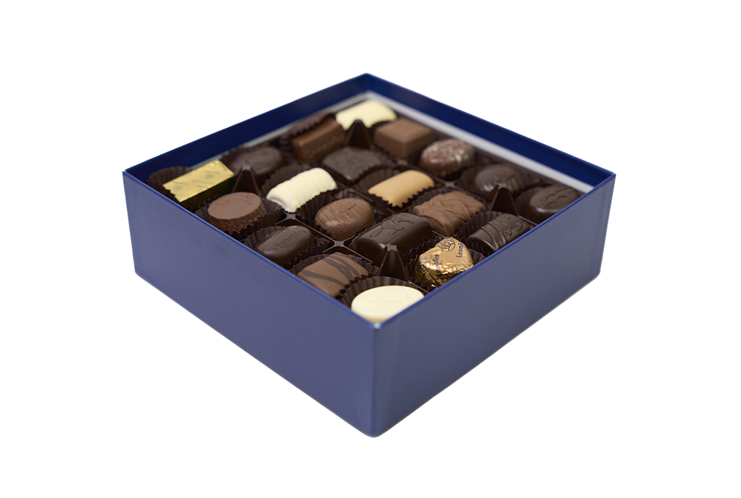 Coffret Santiago Bleu sur 2 étages composé d’un Assortiment de Chocolats : noir, lait et blanc, crème, ganache et praliné, le tout sans alcool.