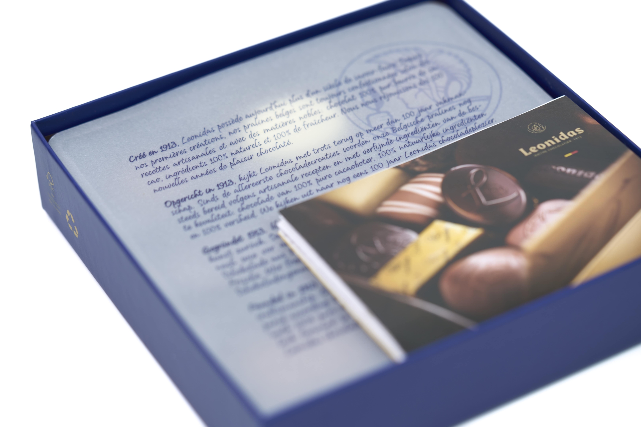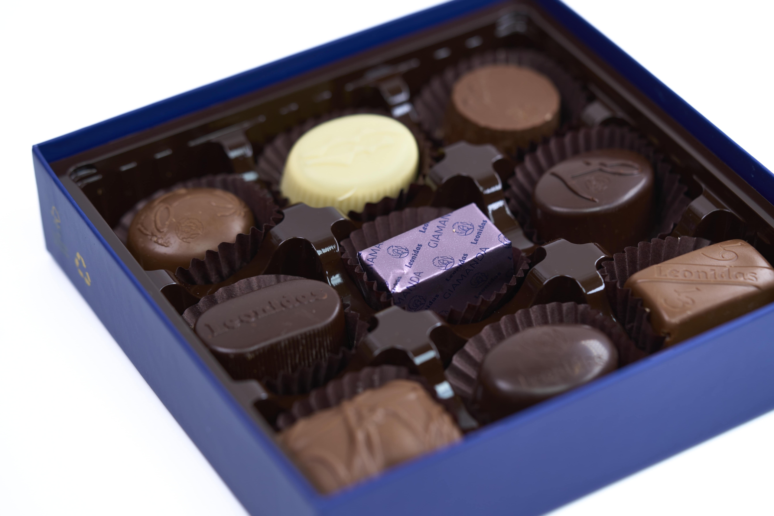 Notre Best-Seller, le coffret Togo Bleu composé d’un Assortiment de Chocolats : noir, lait et blanc, crème, ganache et praliné, le tout sans alcool.