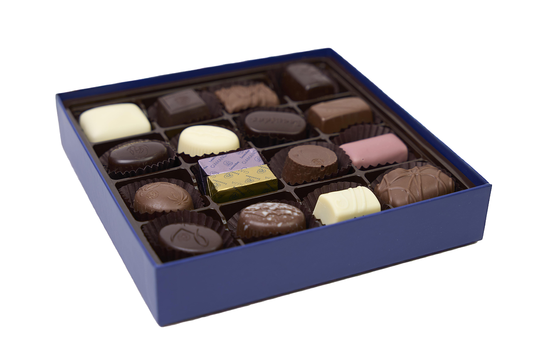 Notre Best-Seller, le coffret Zanzibar Doré composé d’un Assortiment de Chocolats : noir, lait et blanc, crème, ganache et praliné, le tout sans alcool.